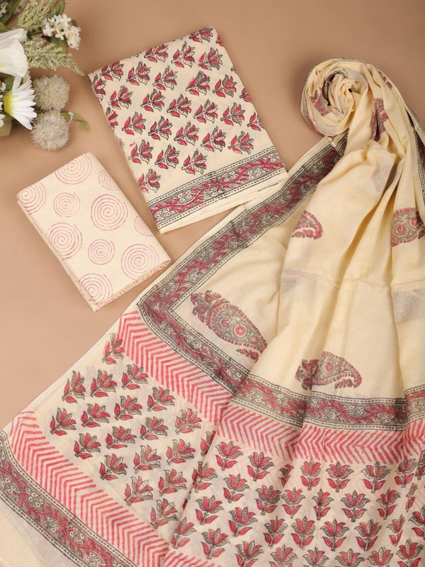 Cream Pink Floral Bagru Handblock Printed Mul Cotton Unstitched Set
