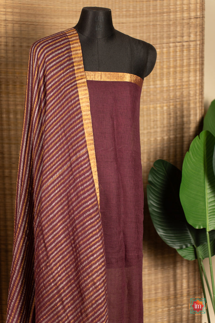 Unique and refined — this handwoven linen saree comes in a deep brown body with a subtle purple shot, creating a rich, dual-toned effect. The saree is accented with zari lines that add just the right touch of shimmer, making it both festive and classy.