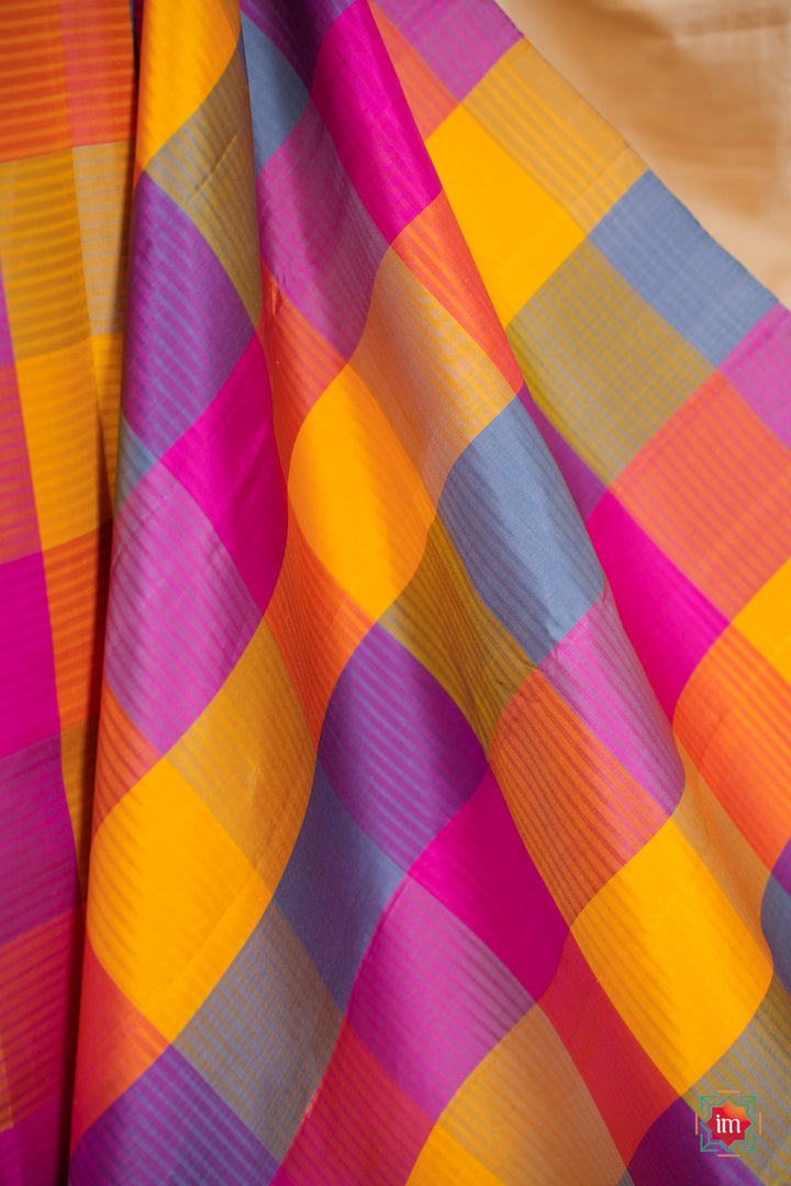 This exquisite handloom Kanjivaram saree features the timeless Palum Pazhamum Kattam - a classic pattern that has graced Kanchipuram looms for generations. Woven entirely in soft silk with intricate threadwork and zero zari, it’s a beautiful expression of understated luxury.