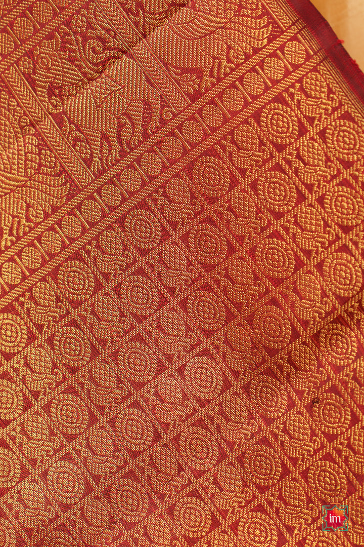 The pallu features magnificent zari work woven with golden zari - an interplay of motis (yaali, rudraksham, annapakshi) creating a subtle brilliance that catches light beautifully. Handcrafted by skilled artisans in Kanchipuram, this saree is a masterclass in balance — timeless in its artistry and refreshingly modern in appeal.