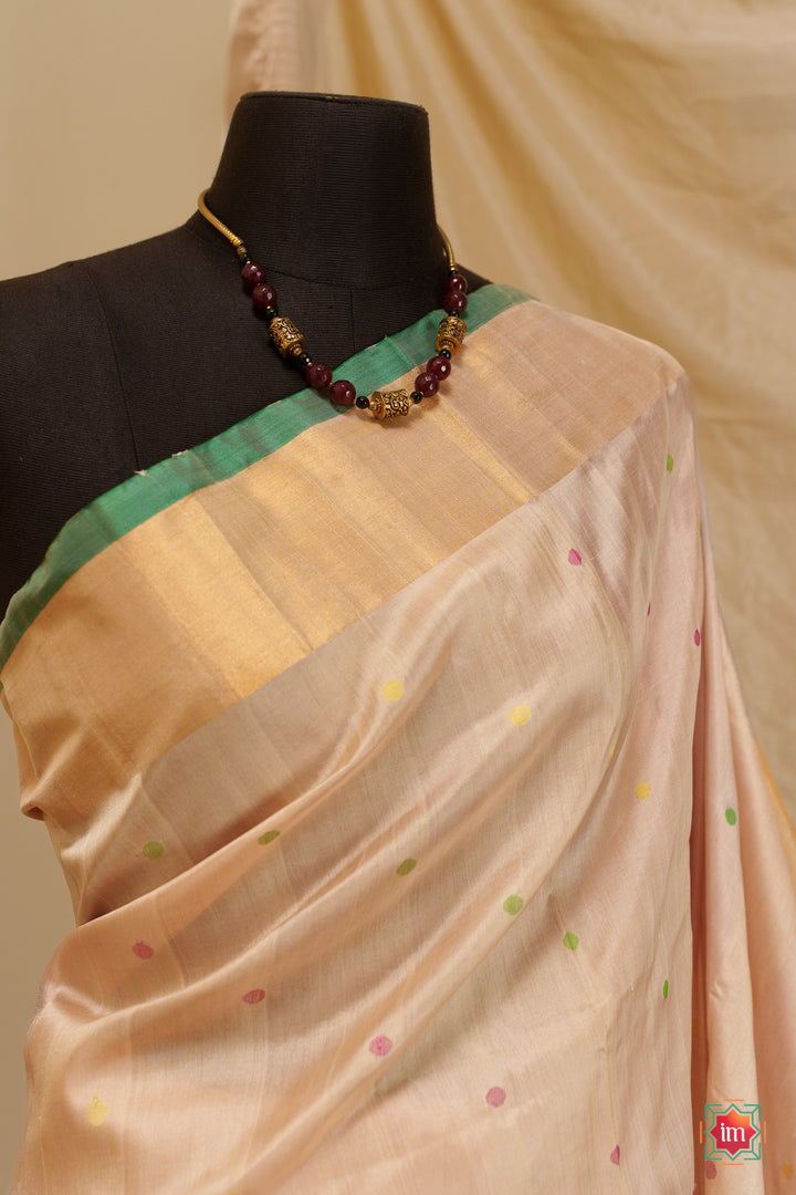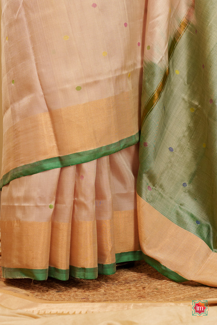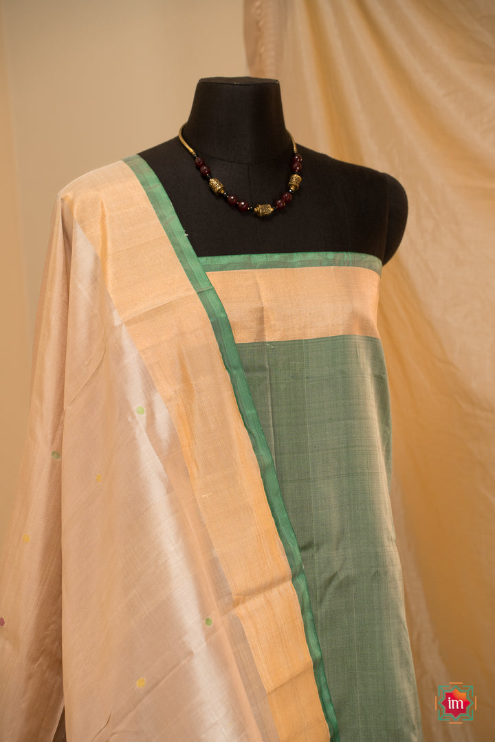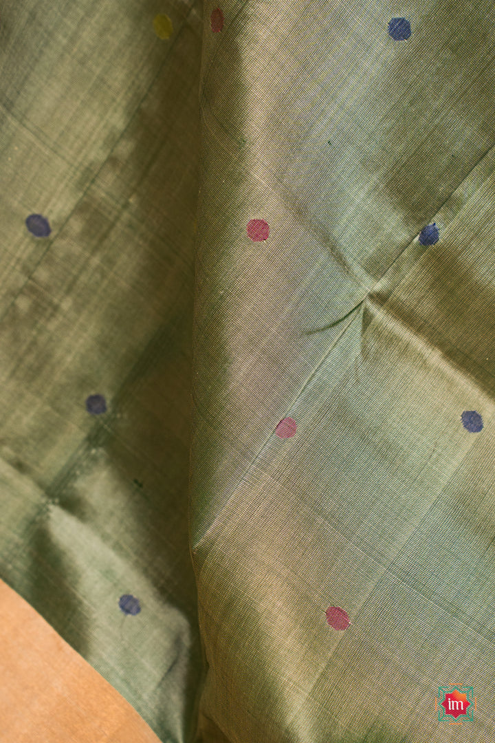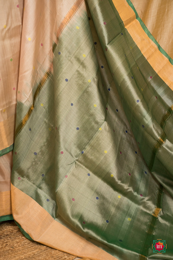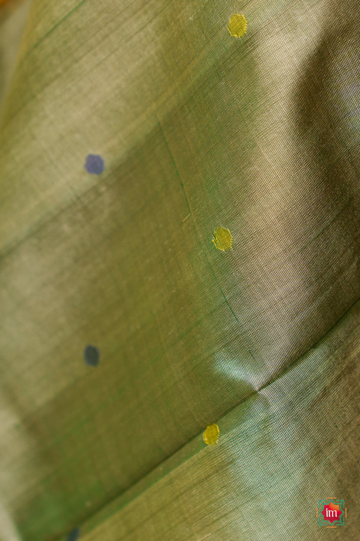 Experience the quiet elegance of handwoven Uppada silk — soft, lightweight, and crafted to drape beautifully. This saree features a subtle cream body with green, yellow and red woven motifs, brought to life by skilled artisans using traditional Uppada techniques. The highlight is its stunning olive green pallu, adorned with delicate motifs and finished with refined zari borders and a green selvedge. Graceful yet striking, this saree carries elegance in every detail.